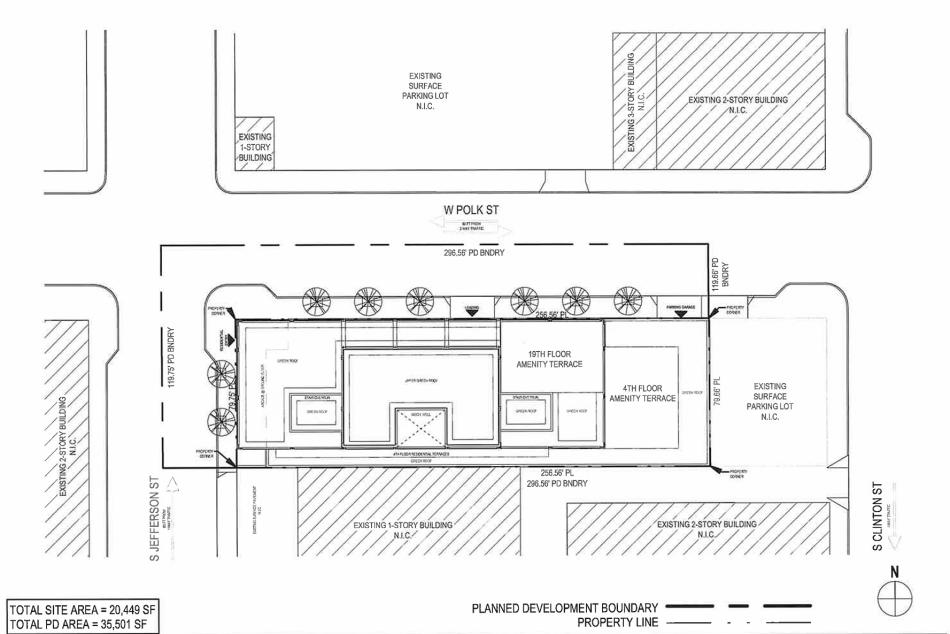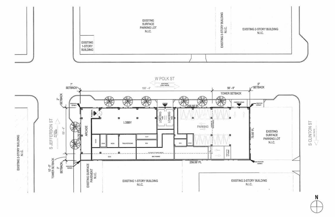 On the ground floor, the building’s lobby would face the corner of S. Jefferson St and W. Polk St. The building’s loading access would be via a curb cut on W. Polk St to the east of the lobby. Parking would be accessed also from W. Polk St with 14 spaces on the ground floor and a ramp connecting up to the rest of the parking spaces located within the podium. The remainder of the ground floor would have mechanical spaces along the back of the property.