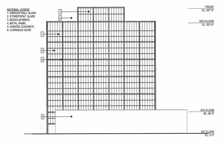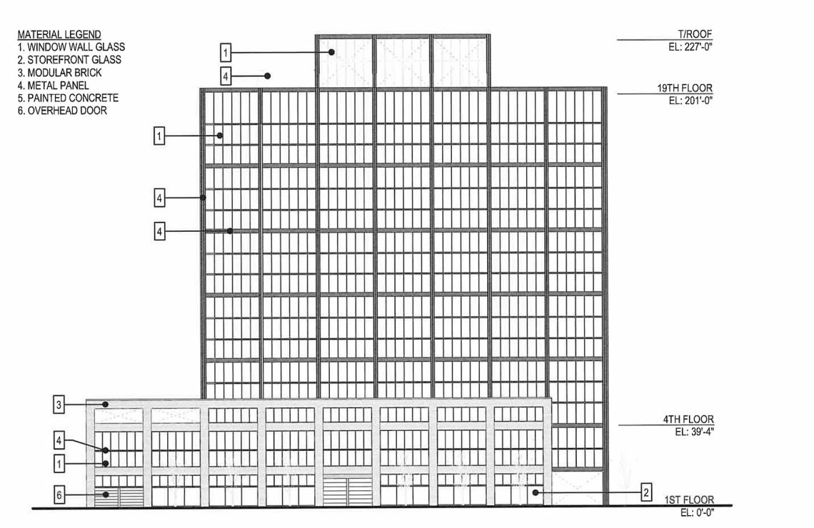 The building design features a four-story podium clad in a gridded brick facade with the residential tower interlocking into the base. The tower would be clad in a gridded metal panel with window wall infill topping out at 227 feet tall.