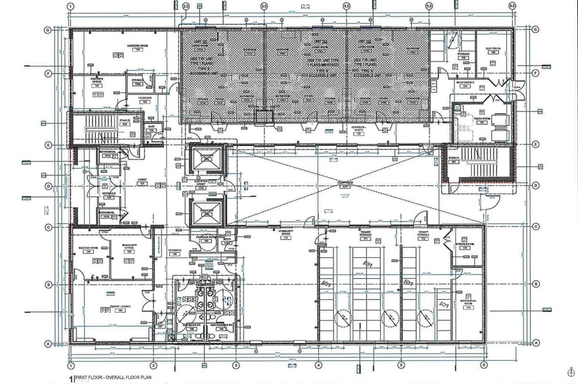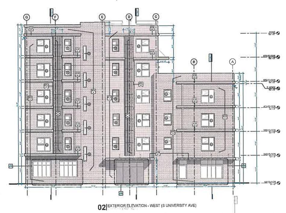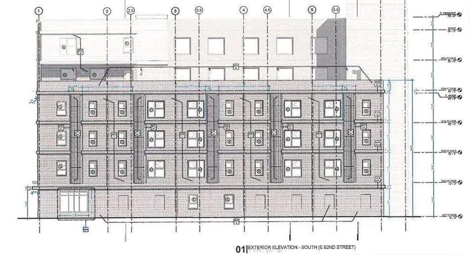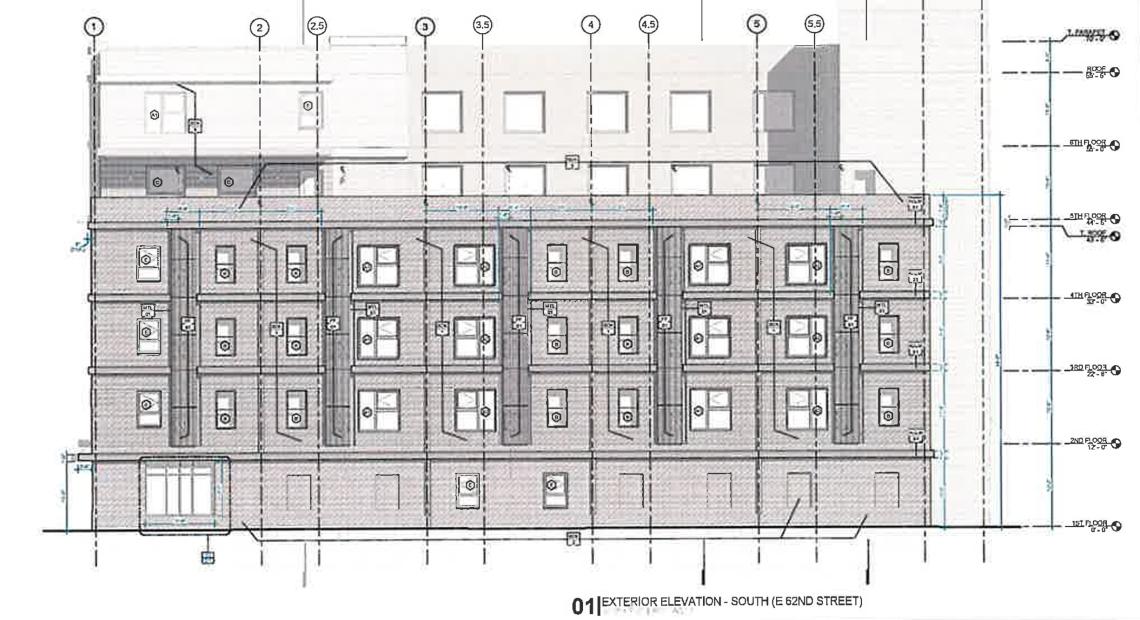 On the ground floor, the building will have a central lobby facing S. University Ave with a tenant lounge, community space, and tenant storage in the southern leg along E. 62nd St. The north leg of the ground floor will have an exercise room, pastor's office, and three residential units.