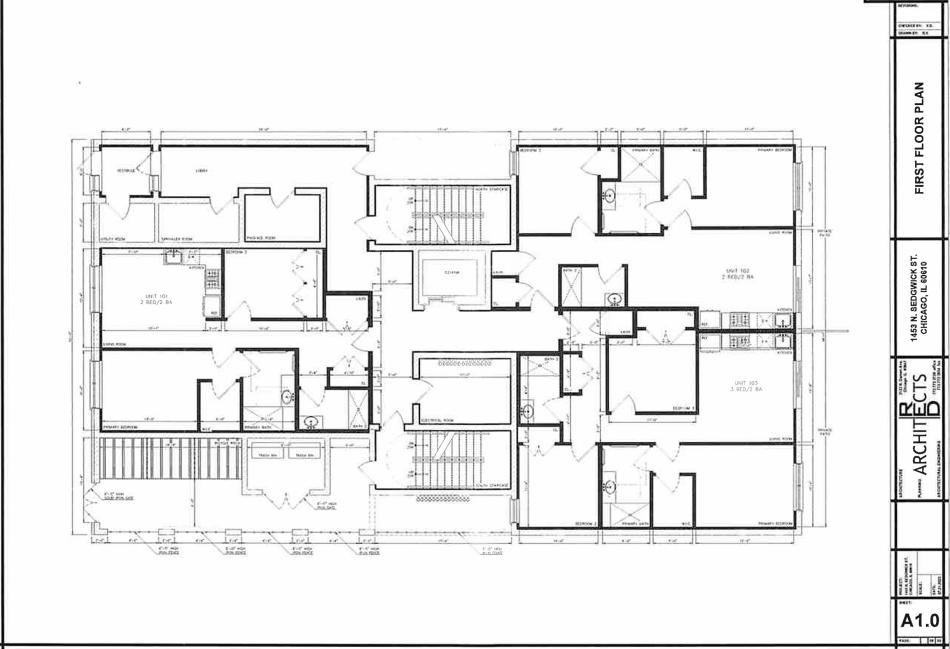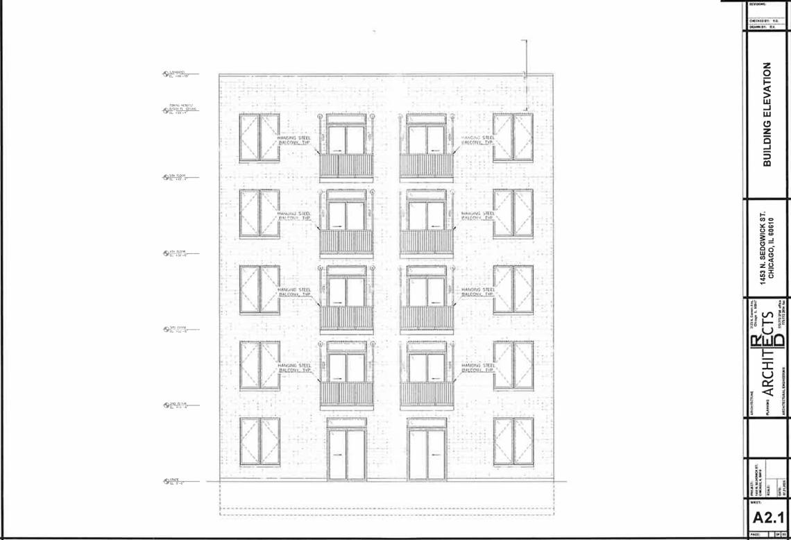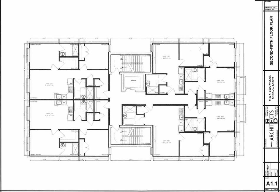 The ground floor will front N. Sedgwick St with the residential entry, a two-bed unit, and an access gate for the bike room and trash room. The back half of the ground floor will have two more residential units. Select units will have small private balconies.
