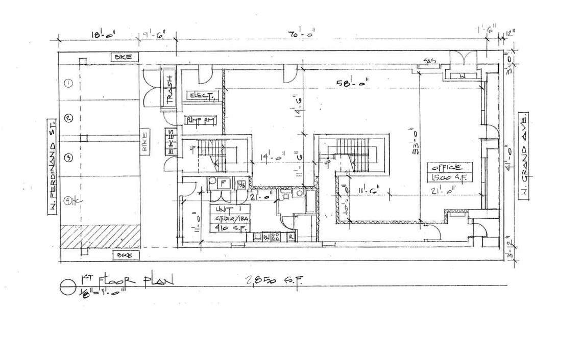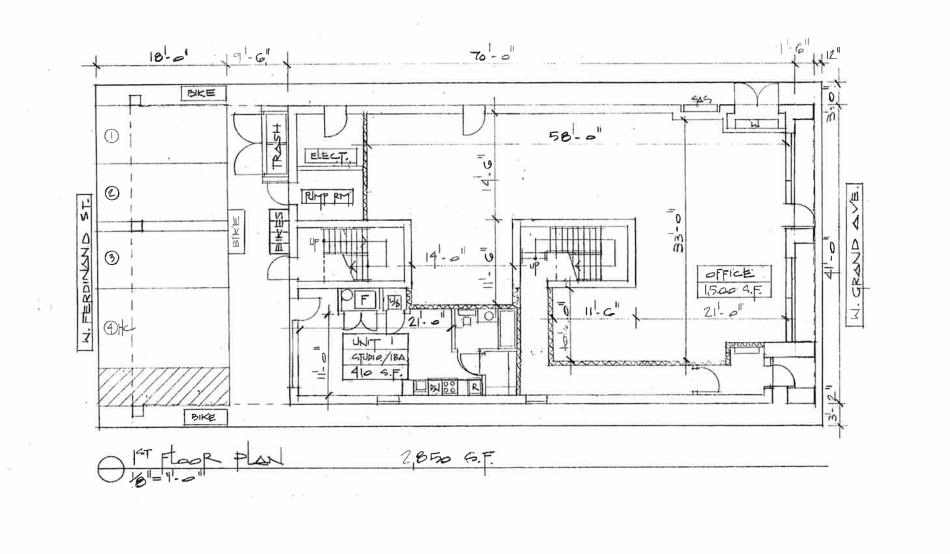 On the ground floor, the building’s street frontage will be made up of the retail space with the residential entry next to it. One accessible studio unit will be located at the back of the building behind the residential entry. Outdoors, the car parking and bike parking will be located along the alley.