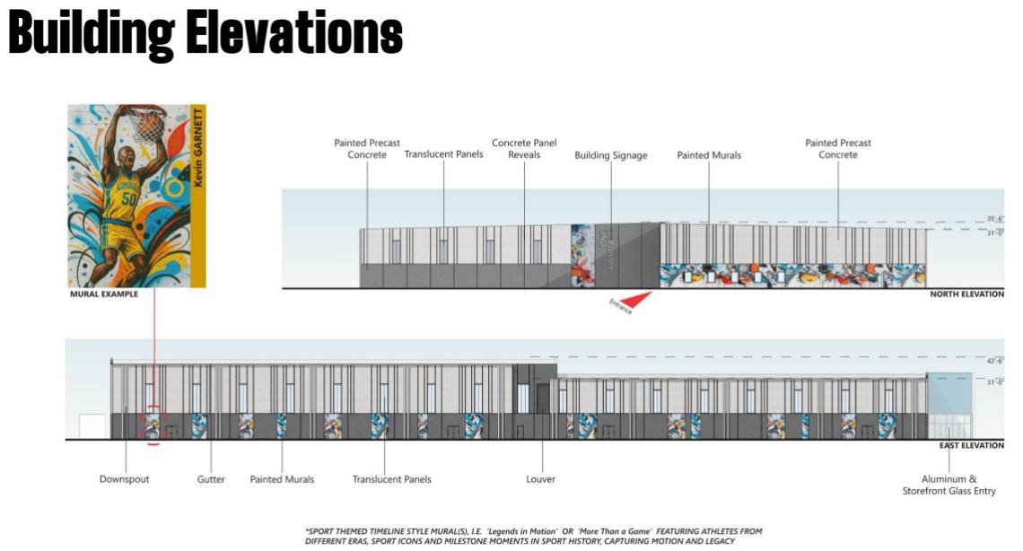 Standing approximately 43 feet tall, the building will be constructed of precast concrete paneling with a two-tone design that includes translucent panels and an aluminum and glass storefront at the main entry. The building’s facade will incorporate space for sport-themed timeline-style sports mural series—such as “Legends in Motion” or “More Than a Game”— celebrating iconic athletes, milestone moments, and the enduring power of sport to unify and inspire. The murals are intended to enhance the public experience of the facility and reflect community identity through visual storytelling.