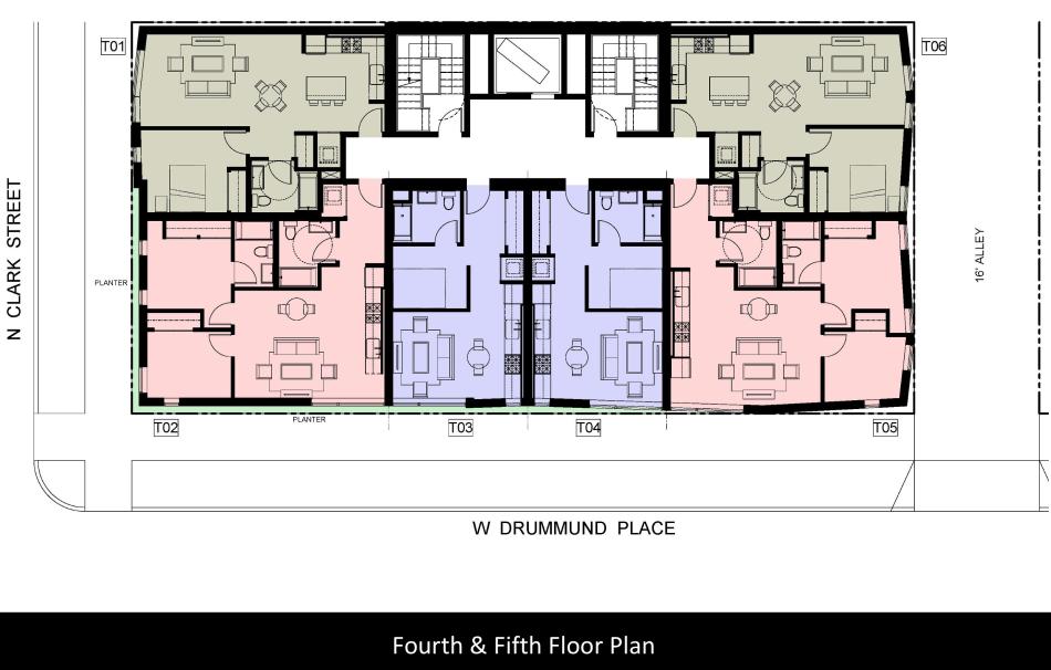 The project’s basement will have mechanical space, bike storage, and a 2,920 square foot commercial space accessed from a ground floor entry along N. Clark St. The ground floor will have a corner retail space measuring 1,900 square feet with the residential entry fronting W. Drummond Pl. One two-bedroom unit will occupy the back of the ground floor fronting W. Drummond Pl and the alley.