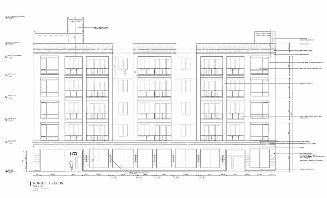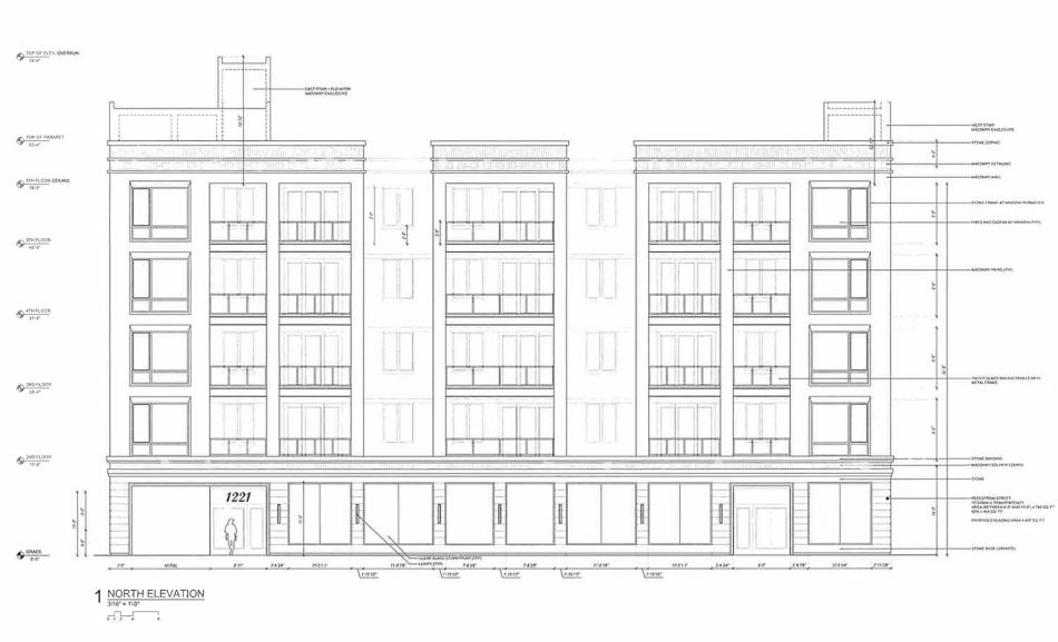 Designed by Moth Architects, the five-story building will stand approximately 78 feet tall and include 40 residential units, 2,238 square feet of retail space, 24 car parking spaces, and 40 bike parking spaces.