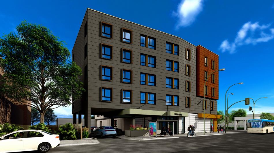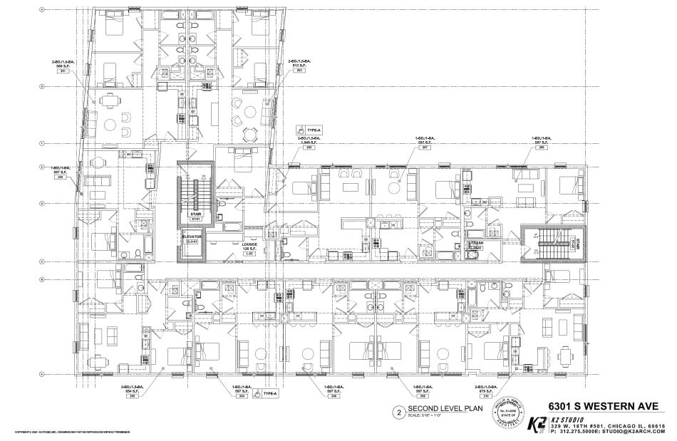 Designed by K2 Studio, the new five-story building will stand approximately 65 feet tall. On the ground floor, the building will have 2,250 square feet of retail space as well as a fitness room and community room all fronting S. Western Ave. The residential lobby will be accessed from W. 63rd St and a shared laundry room will be included behind the lobby. A surface parking lot will have 11 car parking spaces accessed via a curb cut along W. 63rd St.