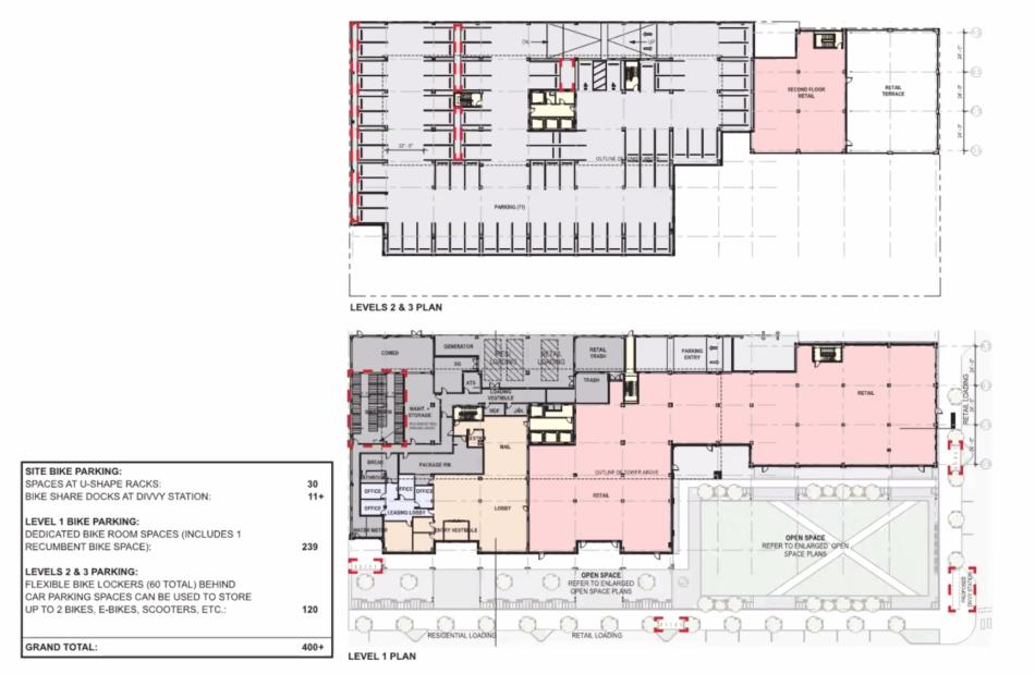 Within the podium, the project’s retail space will wrap around the open space on its north and west sides. The residential entry and leasing offices will face south setback from the street with a strip of open space with drop-off areas along the sidewalk for residents. The ground floor will also include a bike room, mail room, and mechanicals. Loading and parking access will be from the alley behind the building.