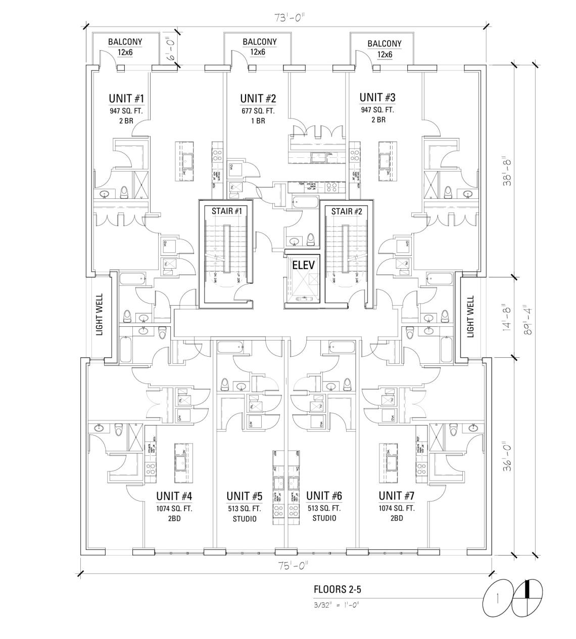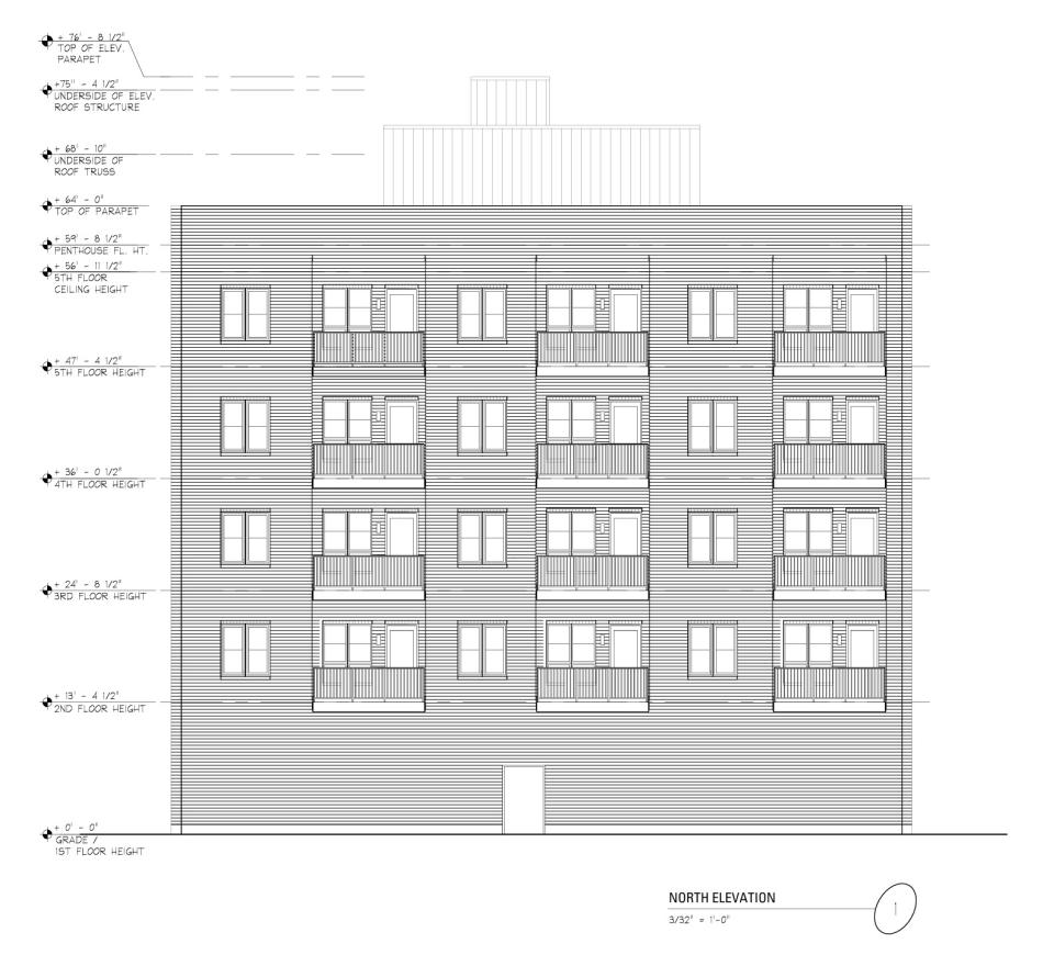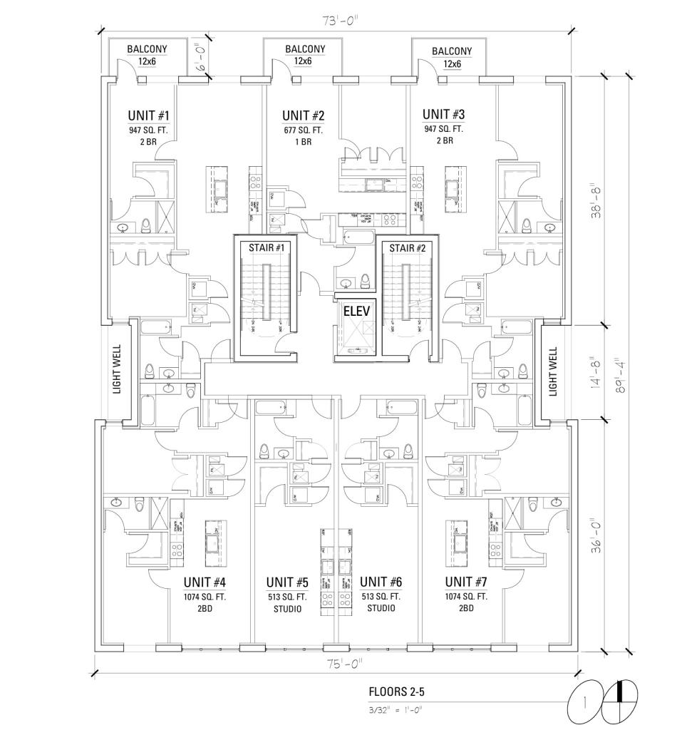 On the upper floors, each floor will have seven residential units with an overall unit mix of 8 studios, 4 one-beds, and 16 two-beds. Rear units will have balconies facing the alley and all residents will have access to a shared rooftop deck.