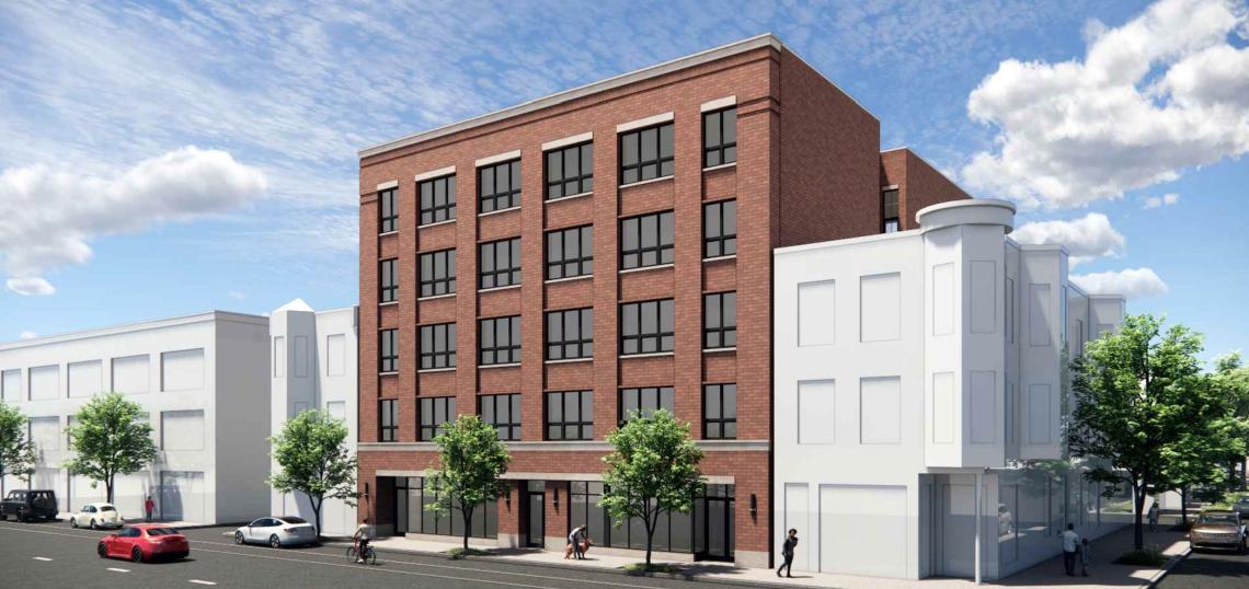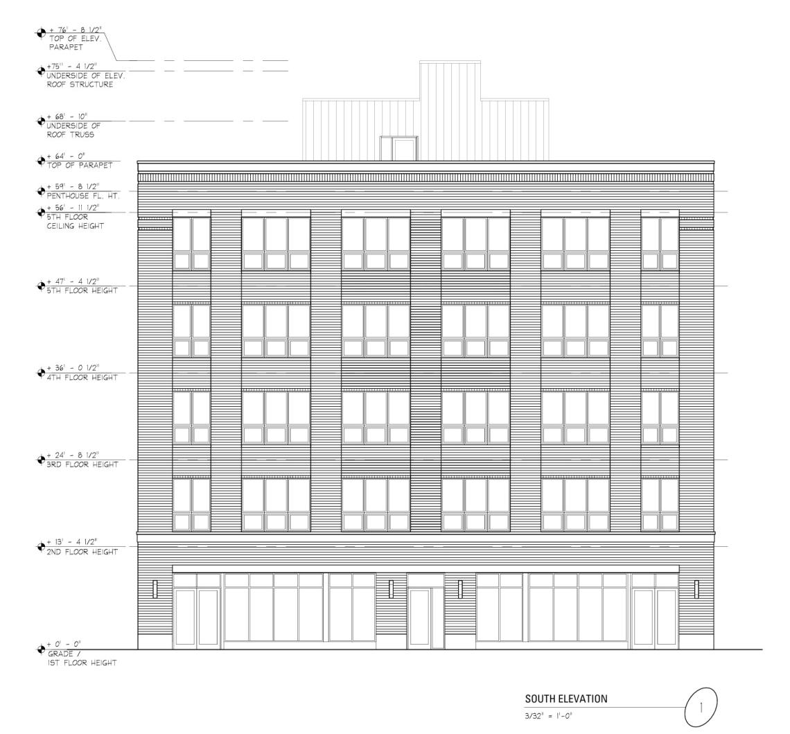 Designed by Jonathan Splitt Architects, the five-story building would stand 76 feet tall and feature 28 residential units, 4,400 square feet of retail space, 8 parking spaces, and 28 bike parking spaces. To meet ARO requirements, the project would include six affordable units.
