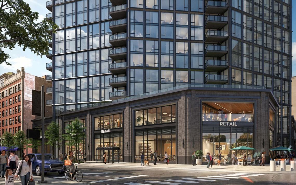 Designed by Antunovich Associates, the 24-story mixed-use building would have 303 residential units, 10,559 square feet of retail space, 150 parking spaces, and 414 bike parking spaces. To meet the 20% affordable requirements, 60 of the units would be set aside as affordable.