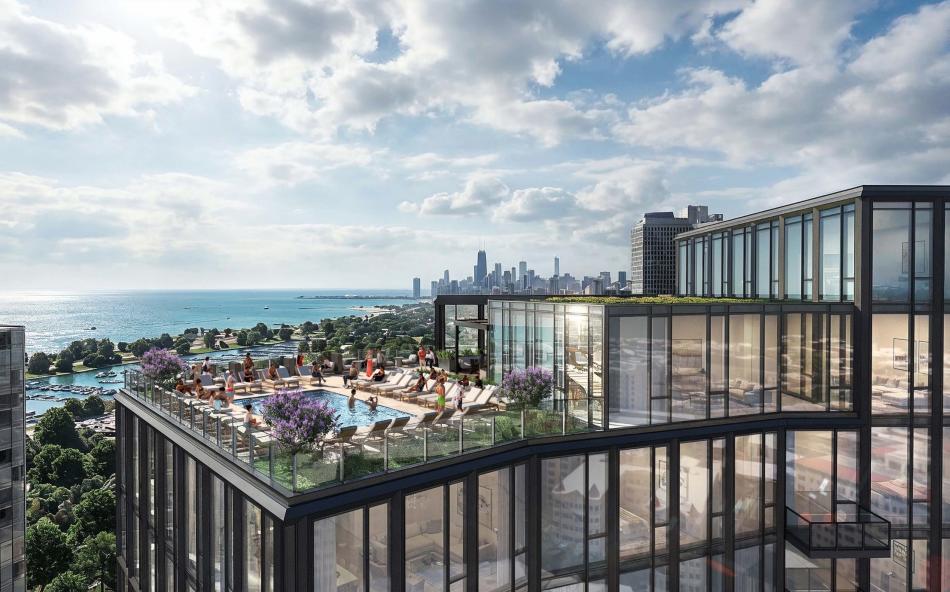The project’s design sites the 281-foot-tall tower on the southern parcel on a two-story podium that connects to a two-story parking garage on the northern parcel of the project site. The two-story podium will be designed in dark masonry with storefront glazing and metal paneling. Rising above, the tower massing has been designed as three connected volumes that stagger in plan to angle the long facade of the building to face southeast towards Lincoln Park and Lake Michigan. Resident balconies are placed into the corners created where the staggered volumes connect.