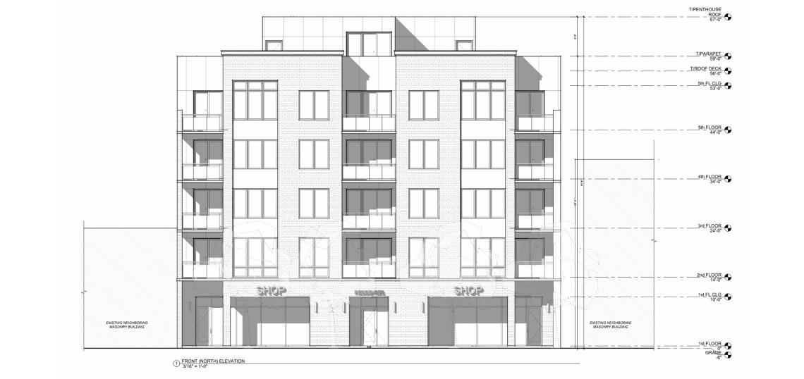 Designed by Thomas Architects, the proposed development would stand five stories tall with 20 residential units, approximately 2,800 square feet of retail space, 15 parking spaces, and 20 bike parking spaces. To meet affordability requirements, four of the units will be set aside as affordable housing.