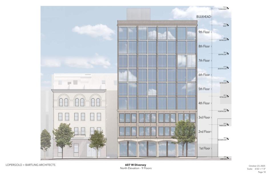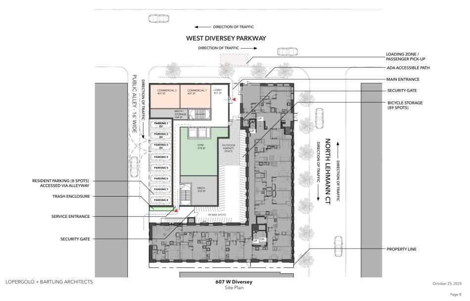 On the ground floor, 862 square feet of commercial space will front W. Diversey Pkwy in addition to the residential lobby. A fitness center and mechanical space fill out the ground floor in addition to eight car parking spaces along the alley. The gap between the new building and 601 W. Diversey will provide space for 89 bike parking spaces.