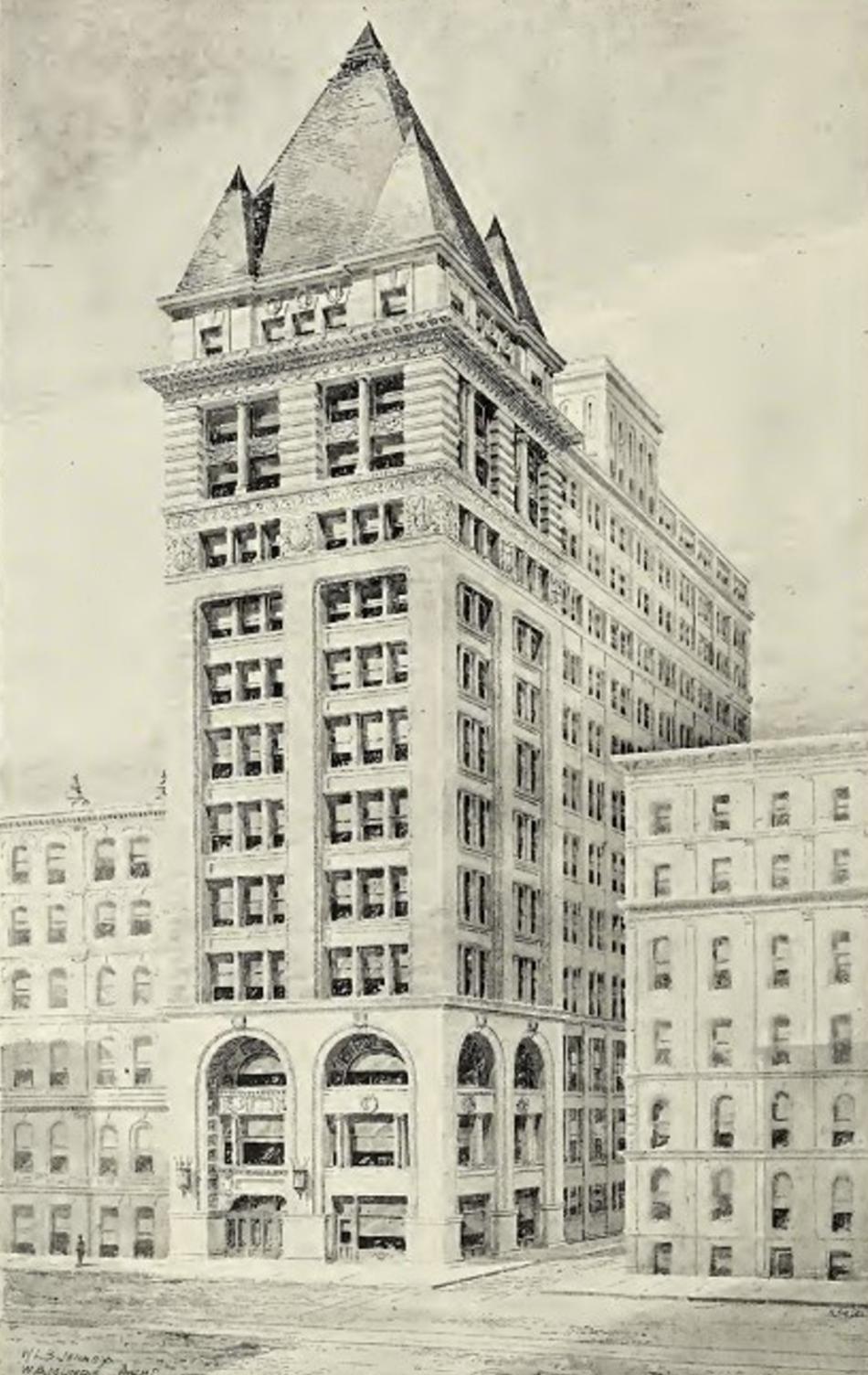 The west tower of the building, both in its original form with Romanesque “campanile” and as redesigned in the Classical Revival style in 1913, presented a traditional face to LaSalle Street, while the stripped-down south elevation reflected Jenney’s functional design philosophy.
