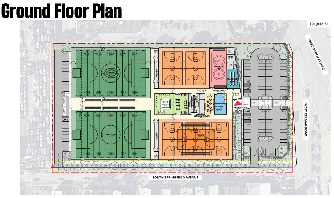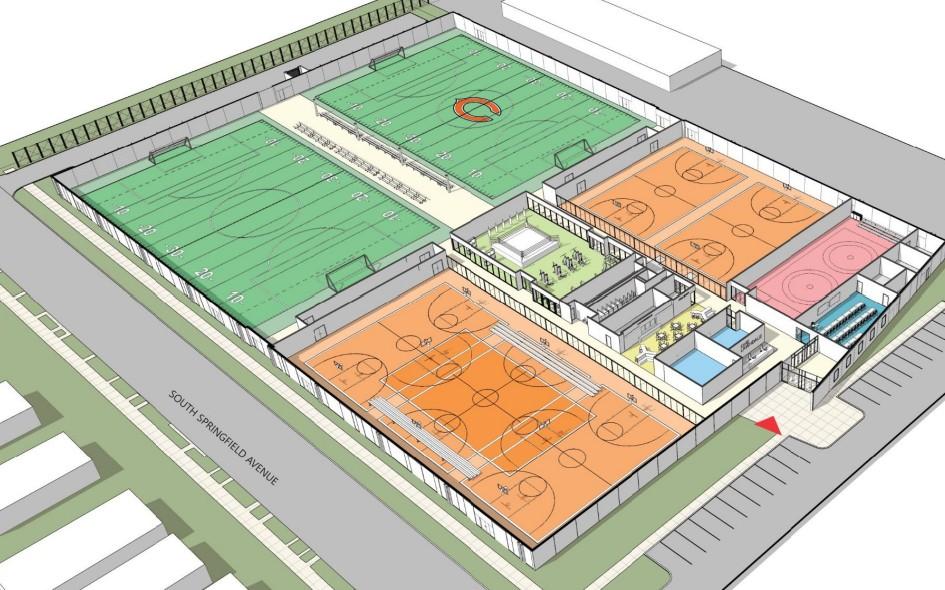 Designed by Wight & Company, One Lawndale Recreation Center is a new recreation facility that will feature two indoor 60-yard turf fields, five full-size basketball courts, a boxing and fitness room, a wrestling studio, a community room, concessions/bar area, a pro shop, and offices.