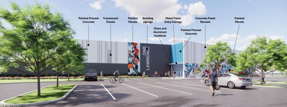 Standing approximately 43 feet tall, the building will be constructed of precast concrete paneling with a two-tone design that includes translucent panels and an aluminum and glass storefront at the main entry. The building’s facade will incorporate space for sport-themed timeline-style sports mural series—such as “Legends in Motion” or “More Than a Game”— celebrating iconic athletes, milestone moments, and the enduring power of sport to unify and inspire. The murals are intended to enhance the public experience of the facility and reflect community identity through visual storytelling.
