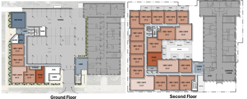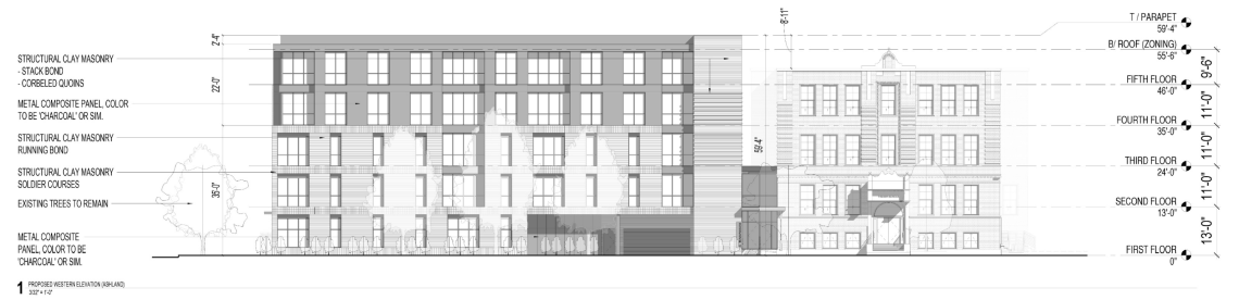 Designed by Kennedy Mann, the five-story metal and brick building topping out at 60 feet would include 78 residential units. The proposed unit mix includes 5 studios, 61 one-beds, 10 two-beds, and 2 three-beds. 16 of these units would be affordable, in accordance with the ARO requirements.