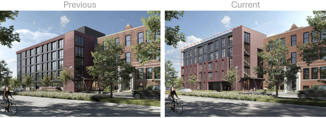 The building’s exterior design was revised to better complement surrounding buildings, including incorporating more brick and less metal paneling, an aesthetically improved facade along Leland Ave, and a step-down from five stories to one story on the north-east side of the building along Leland, which is adjacent to an existing three-story building.