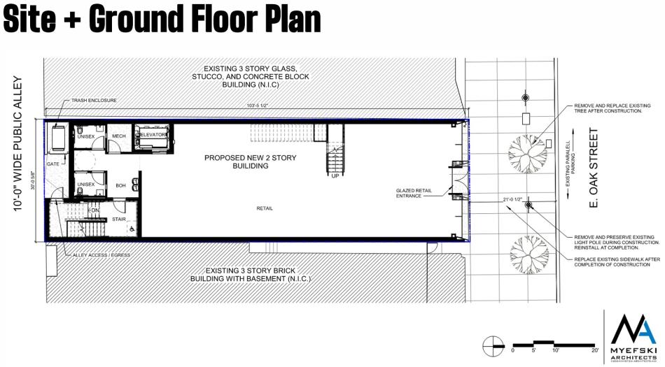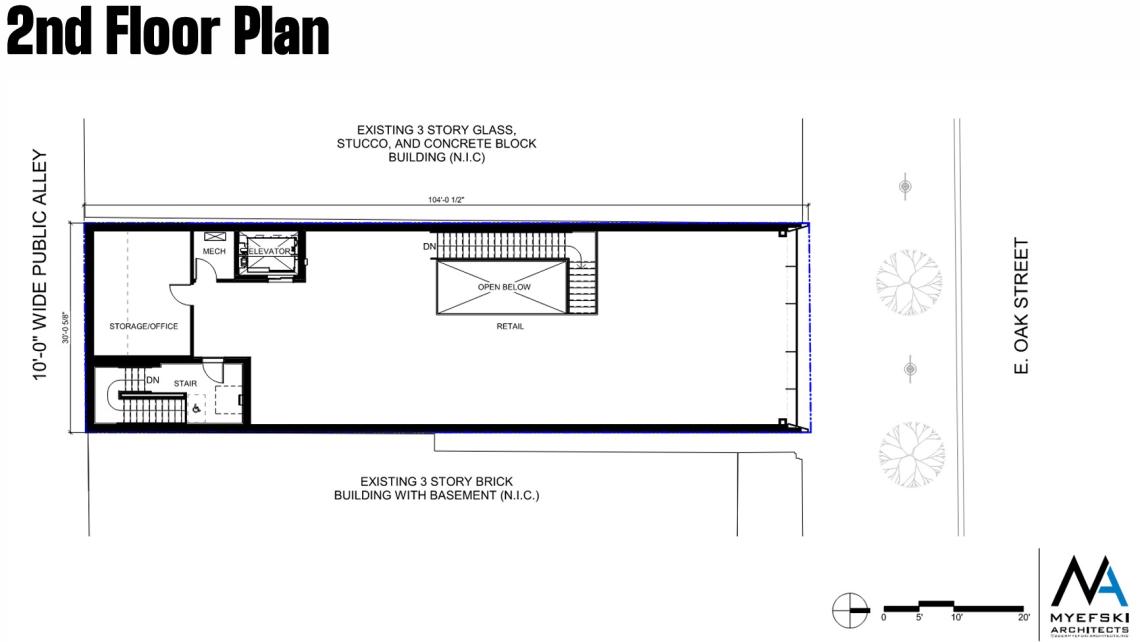 Designed by Myefski Architects, the proposed retail project will be a two-story building designed for a single retail tenant with 5,960 square feet of space. The building is designed with a large open floor plan for the planned retail buildout with a grand stair in the center of the space leading up to the second floor. An elevator and restrooms will be located at the back of the building with a trash room at the back of the building by the alley.