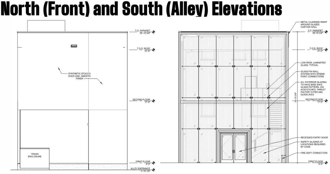 Standing 36 feet tall, the two-story structure will be built lot line to lot line with the front facade fully clad in a glass curtain wall system featuring bird-safe glazing. The remaining facades will all be opaque as they sit on the property’s lot lines.