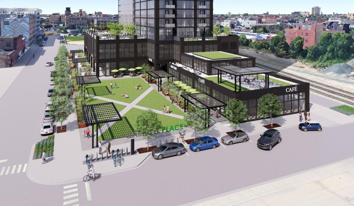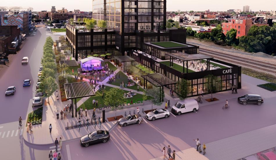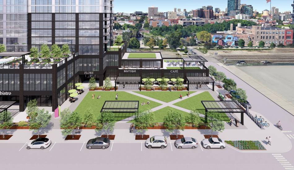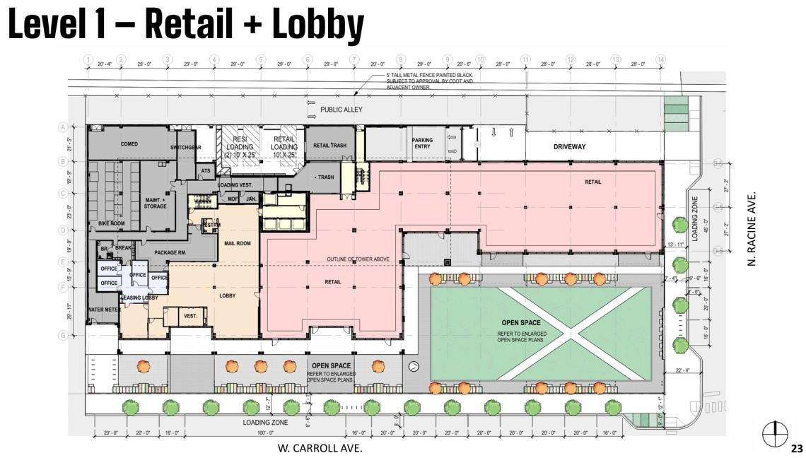 At the ground floor, a large open space will occupy the corner of the site overlooking the intersection of W. Carroll Ave and N. Racine Ave. The green space will be surrounded by greenery, planters with benches and trellises. The space could be used to host farmer’s markets, concerts, and movie nights.