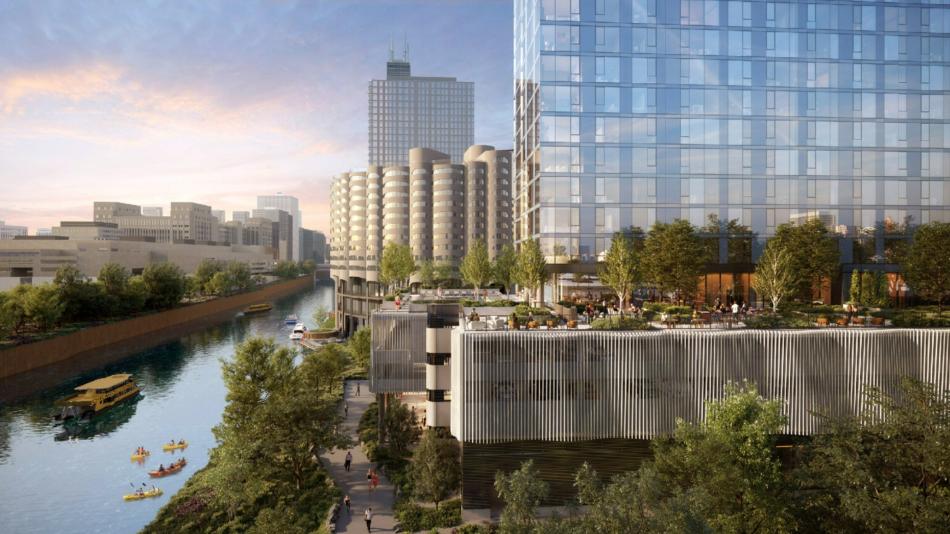On the project site, the property’s frontage on the Chicago River will include a new section of riverwalk with greenery and landscaping. A pedestrian path surrounded by green space and a water feature runs along the north side of the building connecting S. Wells St to the riverwalk.