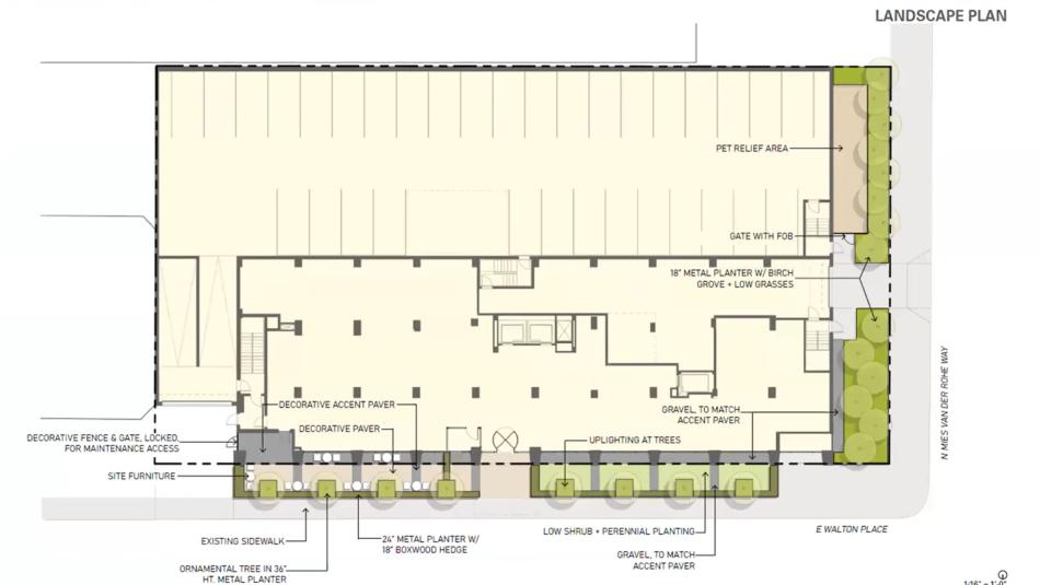 On the exterior, the building’s entrance and streetscape will be enhanced with a modern design and new landscaping along the sidewalk. A dog run will be integrated within the landscaping on the site along N. Mies Van Der Rohe Way.
