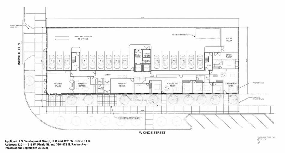 On the ground floor, the long W. Kinzie St frontage will be fronted by amenity spaces and the residential lobby on the east half and two residential units on the western half. The back half of the ground floor along the train tracks will have an interior parking garage with 15 parking spaces accessed via a curb cut on N. Racine Ave. A bike room will be included as well.