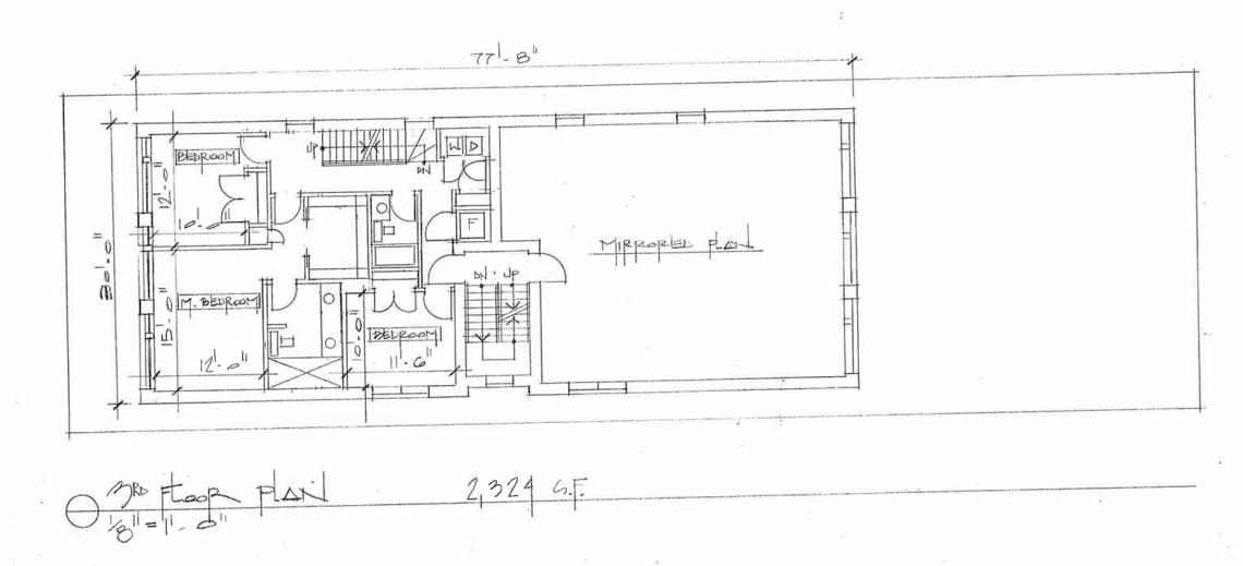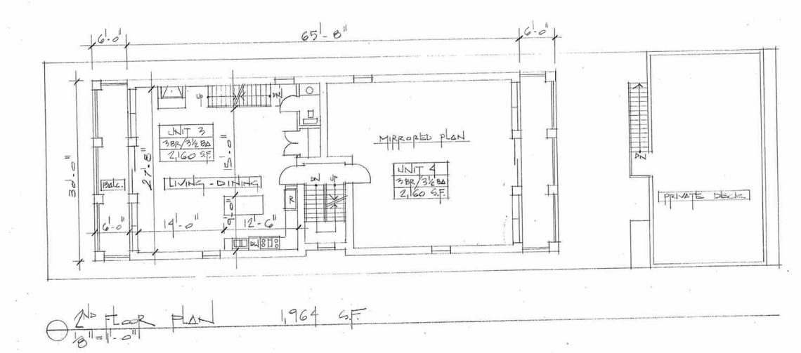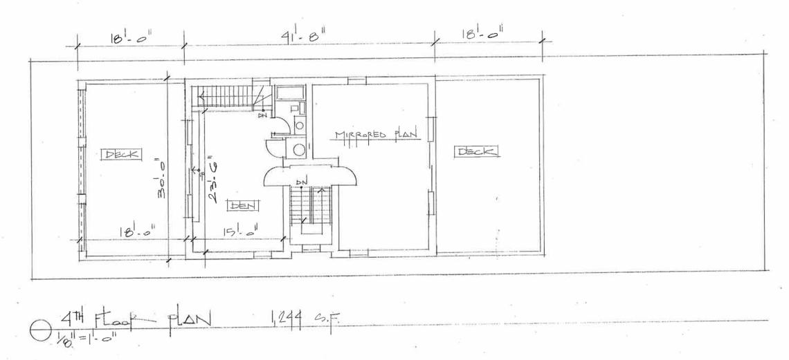 Inside the building, two three-bedroom duplex down units will occupy the ground floor and basement. Two more three-bedroom units will occupy the second and third floors with connections up to a den space for each unit on the fourth floor that opens up to an outdoor roof deck.