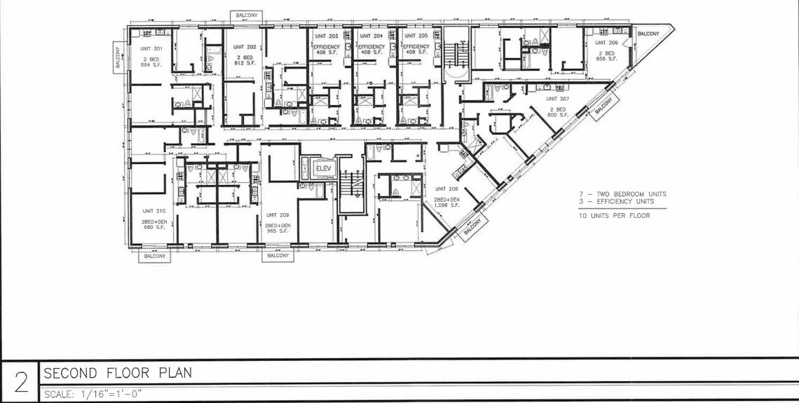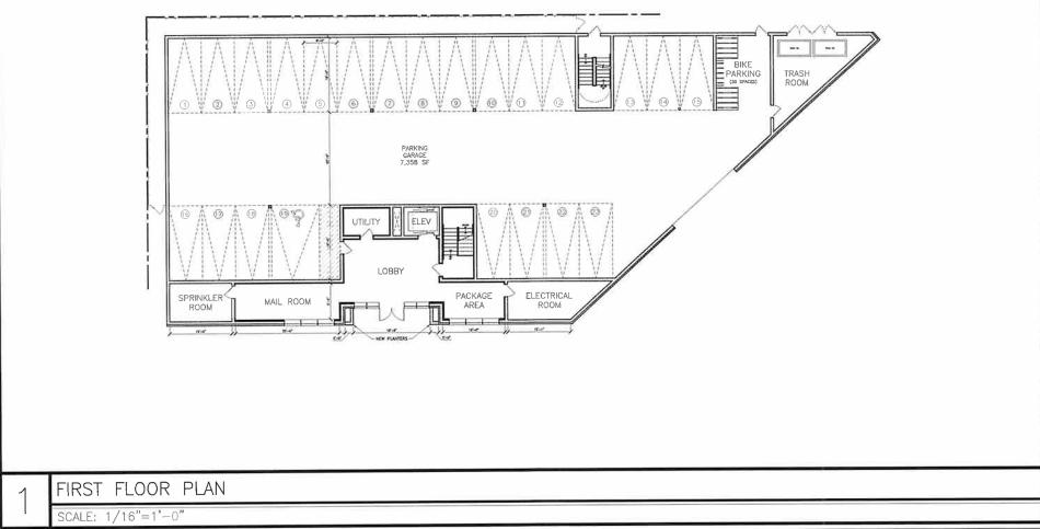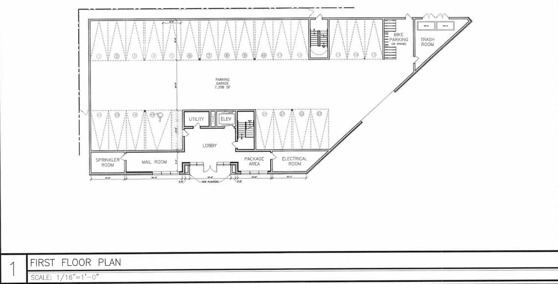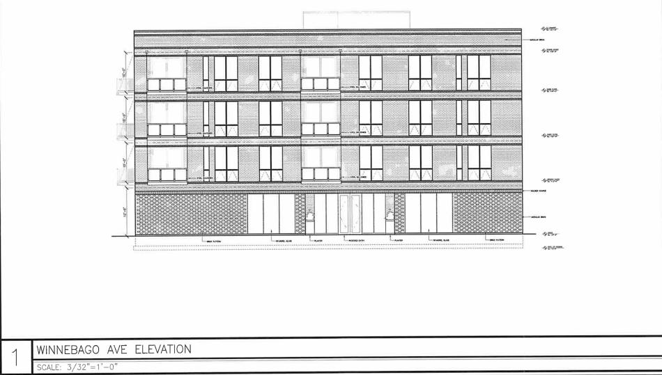 The building’s ground floor would have the residential lobby with mail room and package area fronting N. Winnebago Ave, while the remainder of the ground floor would be occupied by the 23 car parking spaces, bike parking, and mechanical spaces. The parking garage would be accessed via a curb cut on W. Bloomingdale Ave.