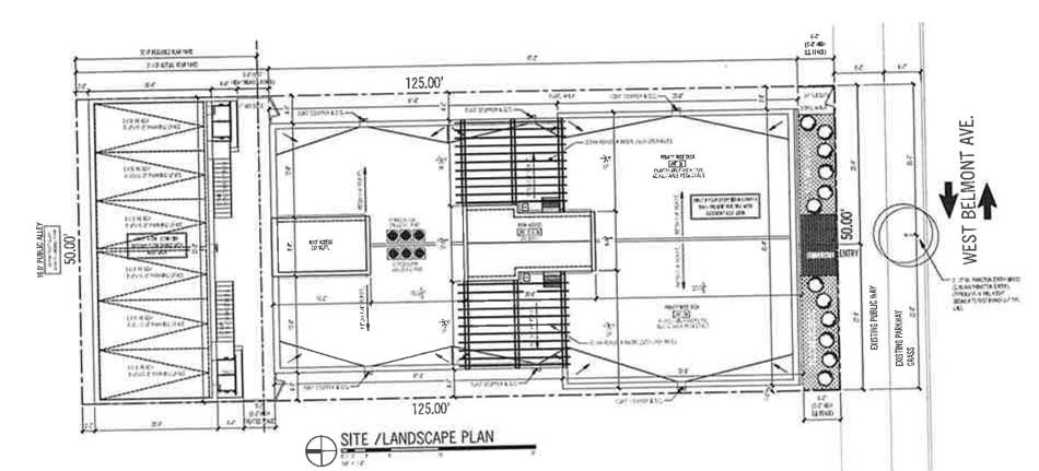 A zoning application has been filed for a proposed residential development at 2210 W. Belmont. Planned by Barrett Homes, the project site is a midblock property near the intersection of W. Belmont Ave and N. Leavitt St. The two one-story commercial buildings that currently occupy the site would be demolished.