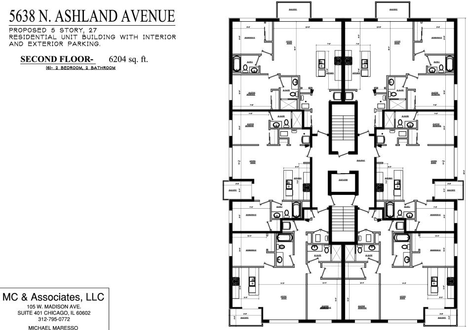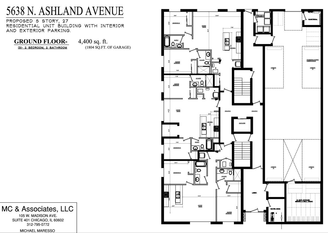 On the ground floor, the building will front N. Ashland Ave with the residential lobby centered flanked by a residential unit and a bike storage room. Three residential units will be located on the ground floor, and the interior garage will provide space for four parking spaces.