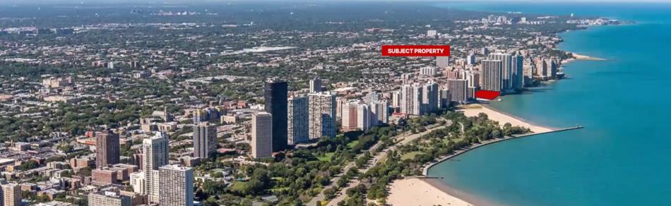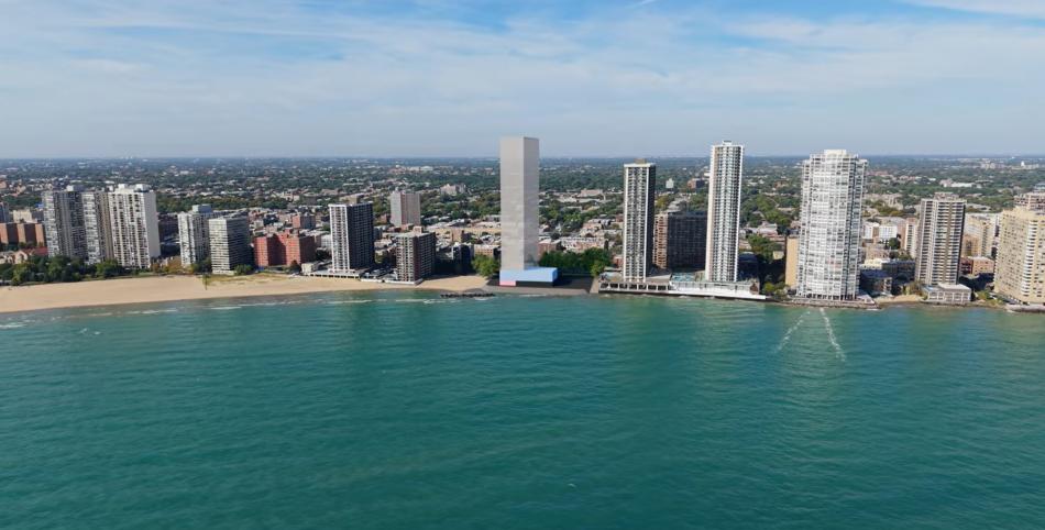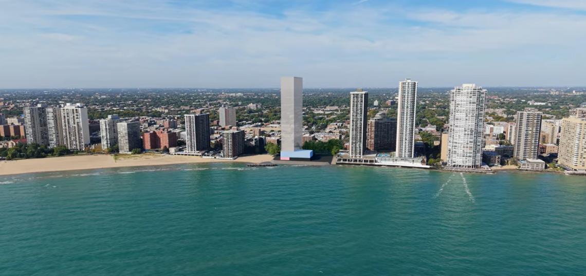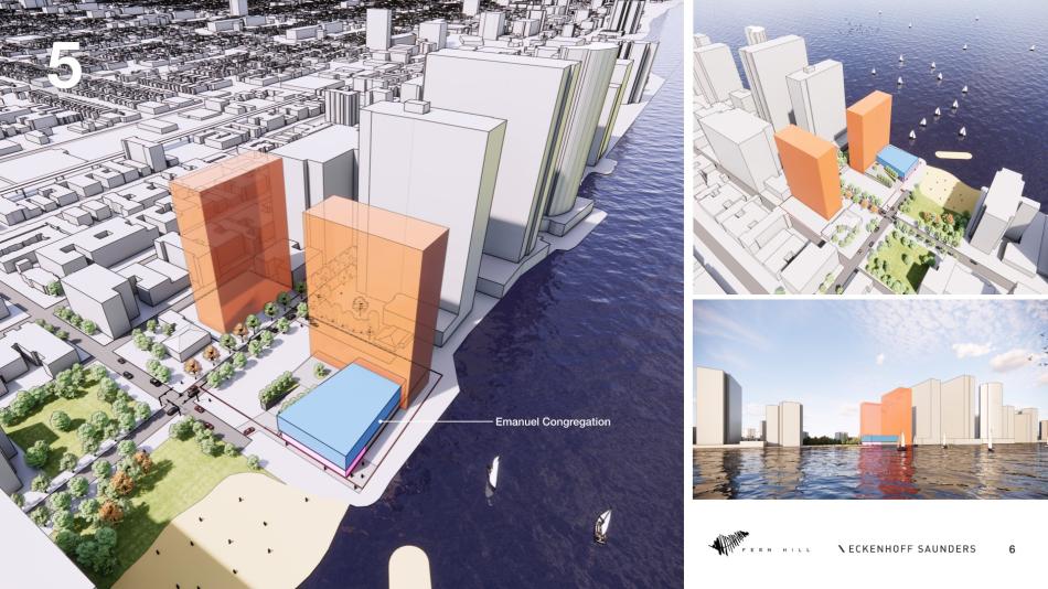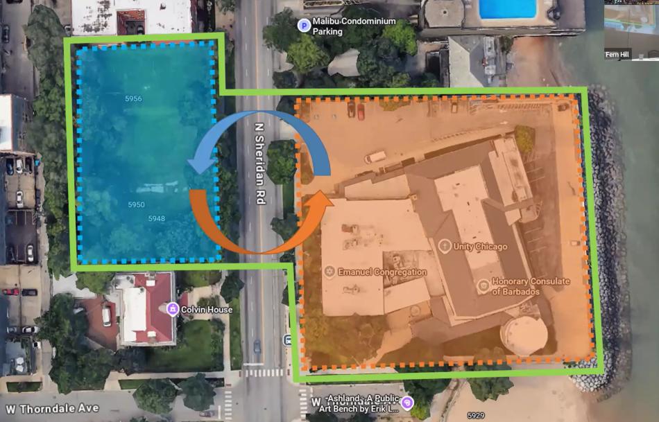 Chicago developer Fern Hill has unveiled plans for a large-scale residential development at the site of Emanuel Congregation at 5959 N. Sheridan. Located along N. Sheridan Rd facing the lakefront, the project would redevelop the synagogue’s lakefront site as well as the vacant site on the west side of Sheridan Rd at 5950 N. Sheridan. The blue house to the north of the congregation’s site has been considered to be included in the project but is not currently part of the plan.