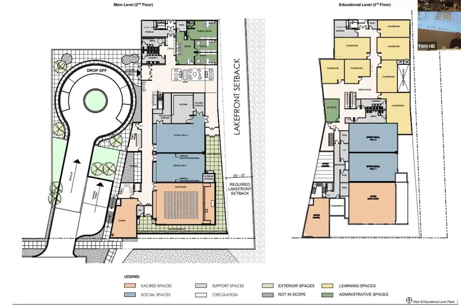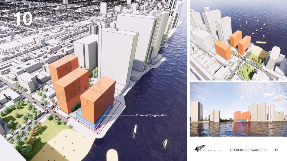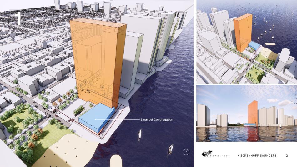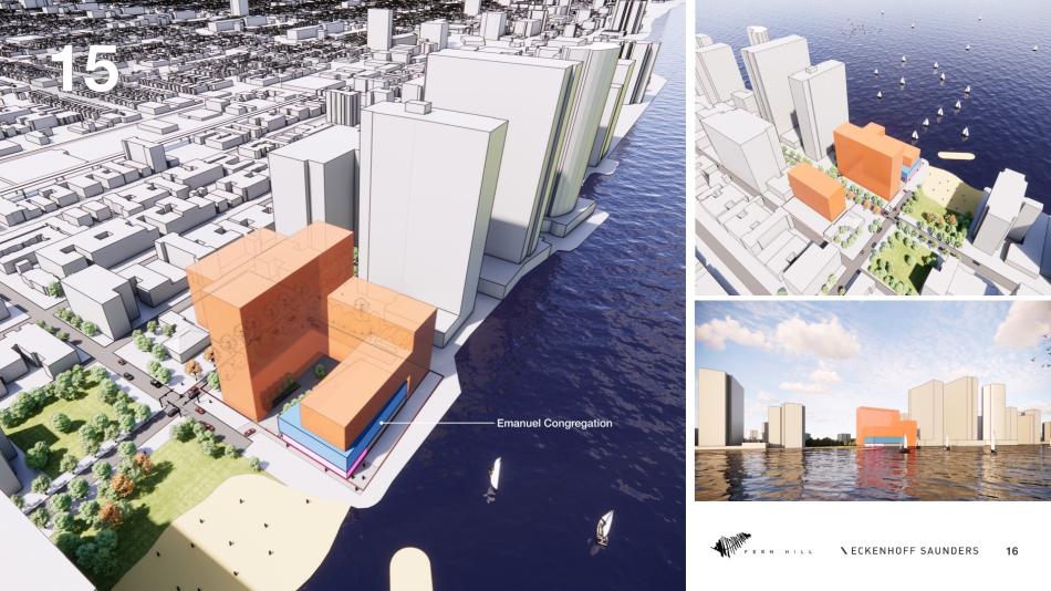 As a combined development of new synagogue and new residential development, Fern Hill is using the value of the residential development to fund the construction of the new synagogue. As the team is very early on in the process, they plan to continue to engage with the congregation and community to take feedback on the proposed massings and development overall. To allow for the scope of the project, the development team will need zoning approvals from the city which would include aldermanic approval and ultimately approval from the City Council.