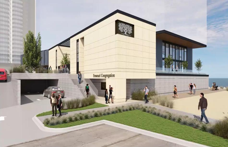 To allow for the demolition of the current synagogue, a new temporary synagogue will be built on the 5950 N. Sheridan site across the street. This temporary space would be built first, then the congregation would move in and demolition of the former synagogue would take place. Once the east site is clear, the new synagogue would be built, and future residential development would follow.