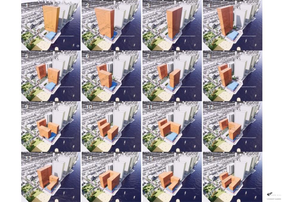 A final grouping of options includes L-shaped buildings either stepping in height or even height. A few options show courtyard building layouts on top of the synagogue with bar buildings on the west site. These options include some of the shortest buildings with some options down to 12 stories.