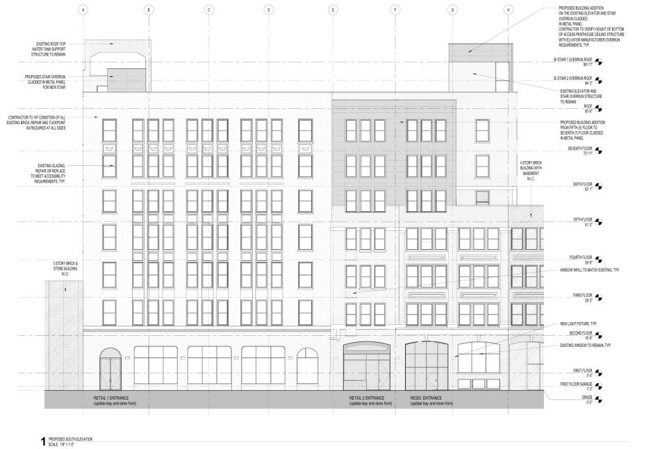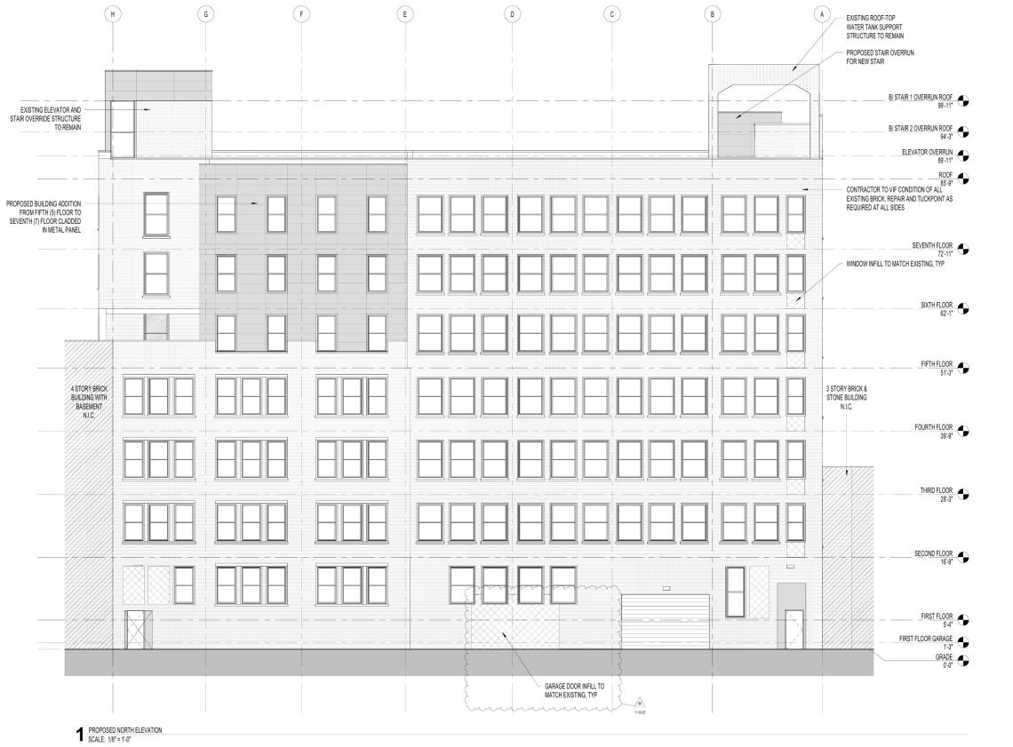 Standing approximately 100 feet in height, the redevelopment of the building will work within the existing envelope of the building for the most part. At the southeast and northeast corners of the building, two three-story additions clad in metal paneling will add space on the fifth through seventh floors. On top of the building, residents will have access to a rooftop deck.