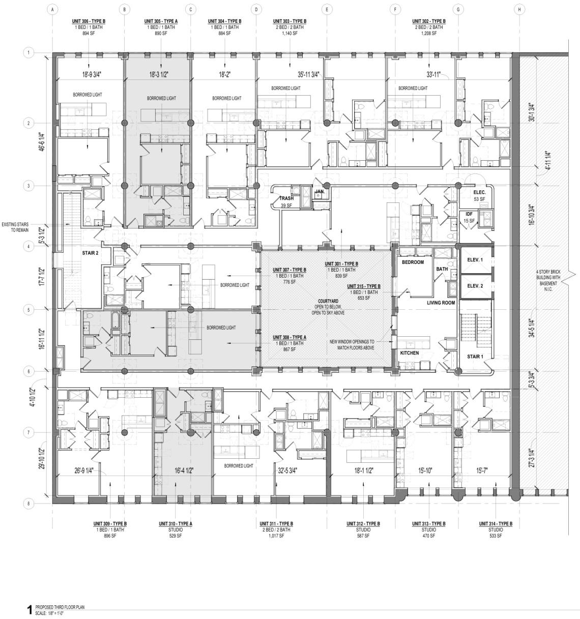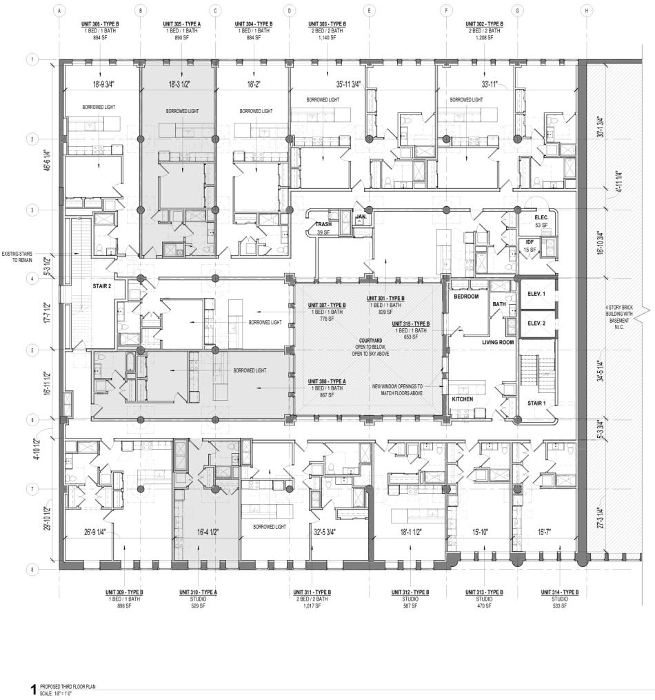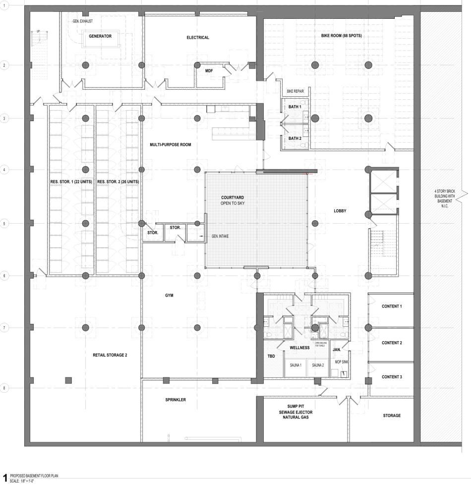 In the basement, residents will have access to an amenity suite that includes a fitness center with saunas, a multipurpose room, and the central courtyard accessible from the basement level as outdoor space. Bike parking as well as resident storage will also be included. The remainder of the basement will have mechanical space.