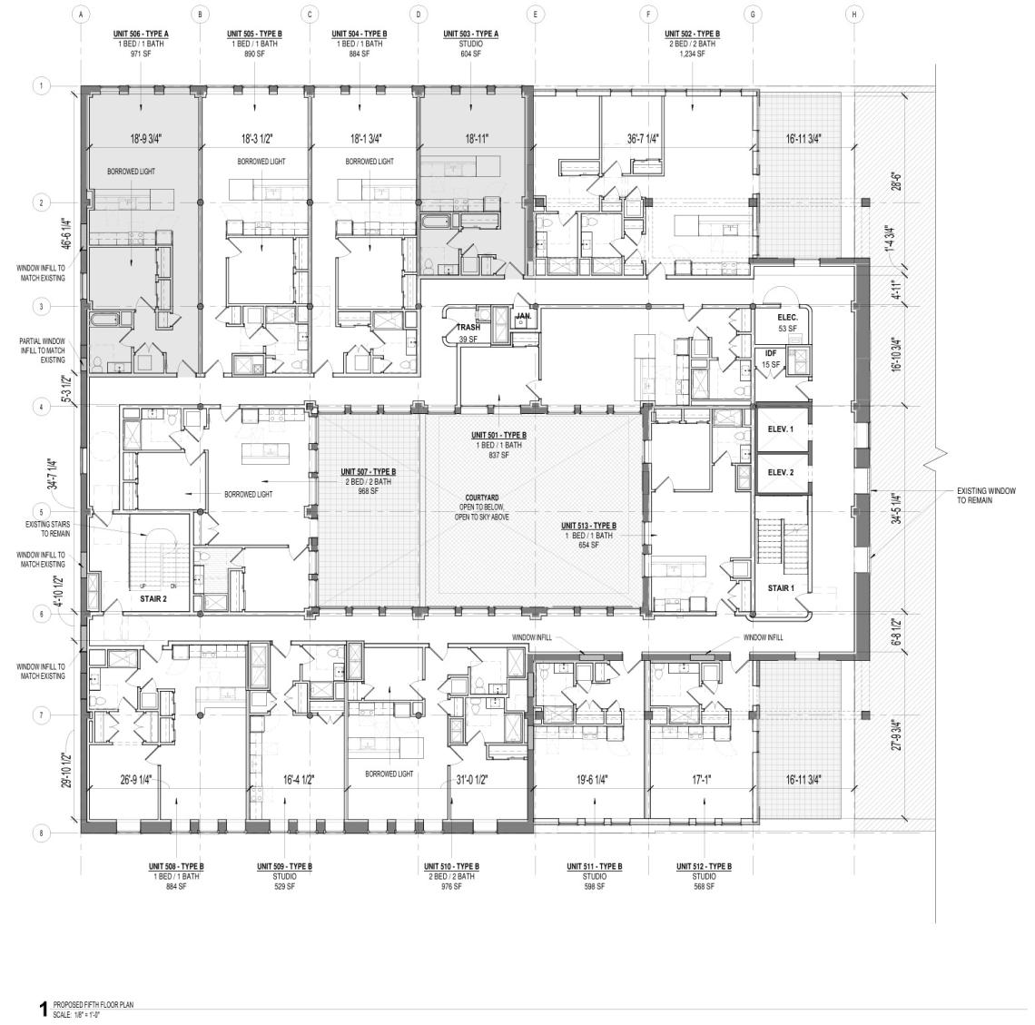 In the upper floors of the building, floors two through seven will house the remaining 84 residential units. With each floor responding to unique elements within the building, the floors each have 13-15 units per floor. The total 88 units feature a mix of 29 studios, 40 one-beds, and 19 two-beds.