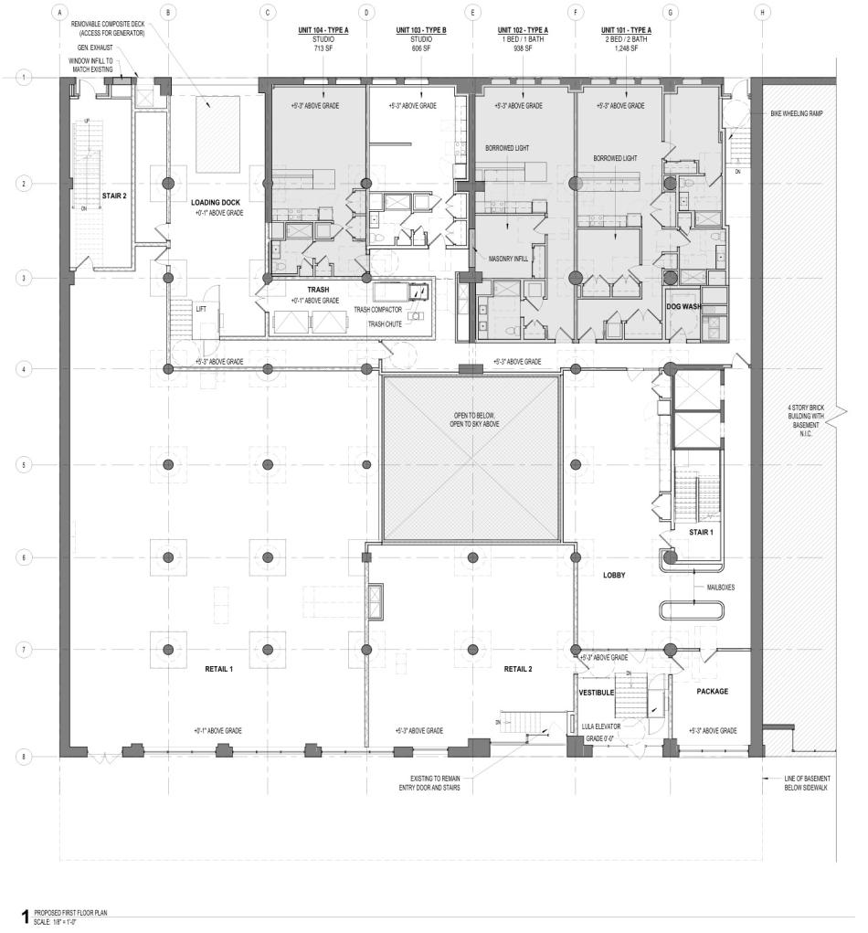 On the ground floor, the building will have retail space fronting E. Superior St with the residential entrance at the east side of the building’s street frontage. Inside, the lobby will have a package room, mailboxes, and a view into the central courtyard of the building. At the back, there will be four apartments facing the alley as well as the loading dock with trash room.