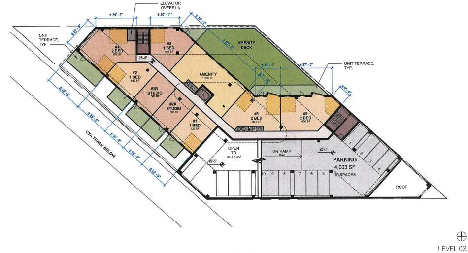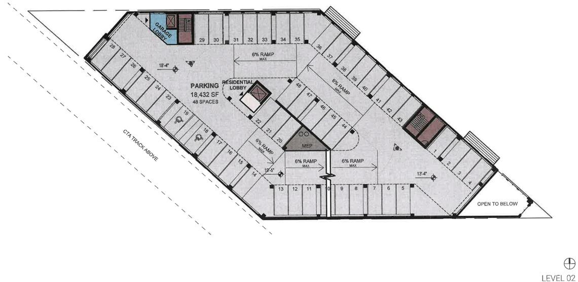 Above the ground floor, the building’s podium will feature a full floor of parking on the second level with a dedicated elevator and garage lobby for public access. The third floor will have parking at the south end with eight residential units in the northern leg of the floor. A residential amenity space will be included that provides access to an outdoor amenity deck that faces north overlooking the intersection of N. Milwaukee Ave and W. Wabansia Ave.