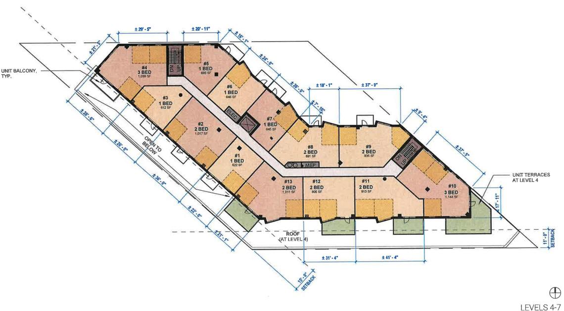 Topping out at 78 feet tall, the residential tower component will have four full residential floors with 13 apartments per floor. With a total unit count of 60 apartments, the project’s unit mix will include 2 studios, 23 one-beds, 27 two-beds, and 8 three-beds.
