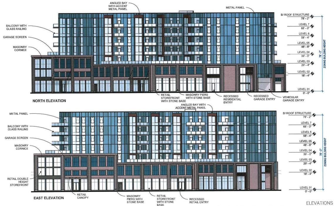 Designed by FitzGerald, the seven-story mixed-use building would include 10,763 square feet of retail space, 60 residential units, and a total of 67 parking spaces, down from the 105 parking spaces originally proposed back in September. 12 of the spaces will be set aside for residents and 55 are planned to be made available as public parking. 12 of the apartments are planned to be set aside to meet ARO requirements.