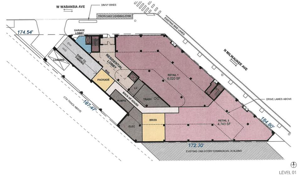 The building’s ground floor will have two retail spaces facing N. Milwaukee Ave and wrapping around the corner onto W. Wabansia Ave. The residential entrance will face W. Wabansia Ave with the parking and loading access for the building via a curb cut on W. Wabansia Ave to the west of the residential lobby. A bike room and mechanical spaces will be located at the back of the building.