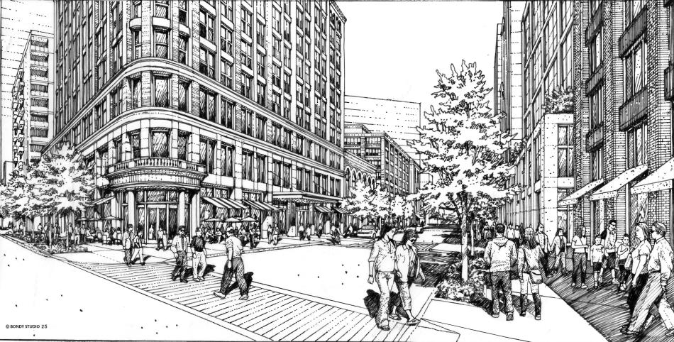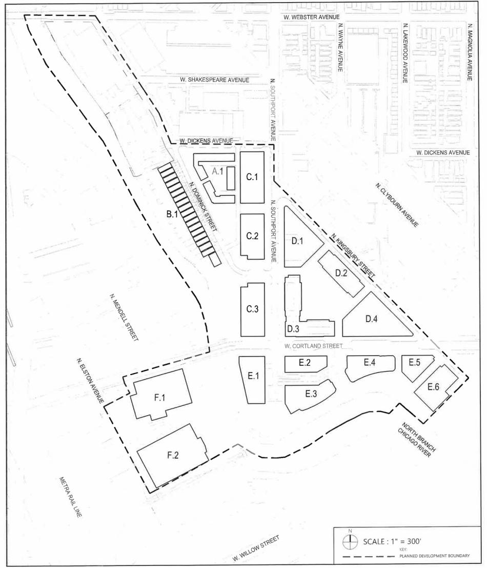 With N. Southport Ave situated as the main north-south axis, Site C runs along its west side and will have a 12-story residential building, 20-story residential building and 25-story residential building getting taller as they go south culminating with the 25-story building at the northwest corner of N. Southport Ave and W. Cortland St. The maximum height in Subarea C will be 300 feet tall with a total of 950 residential units across the three buildings.