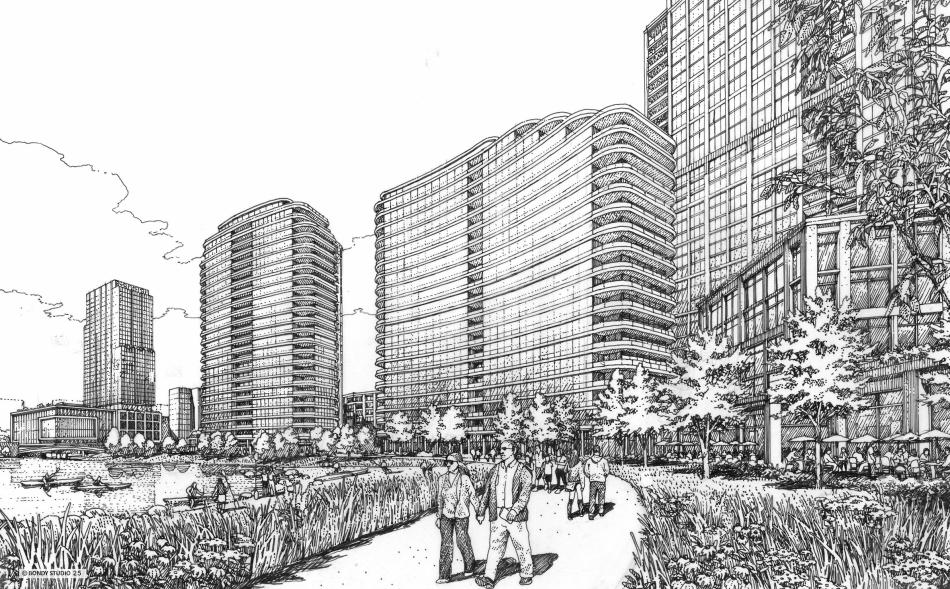 Designed by Hartshorne Plunkard Architecture, the scheme will cover almost 28 acres with a maximum of 3,690 apartments and condos, 19 single family homes, 28 townhomes, 180-200 hotel rooms, 350,000 square feet of traditional and medical office space, and 420,000 square feet of retail space. According to the affordable housing requirements in the Planned Development, the plan is to build just 3,207 residential units with 305 owner-occupied units and 2,902 rentals. 641 ARO units would be required once fully built out.