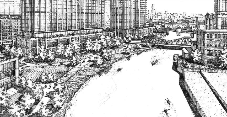 Site F, located on the west side of the river bounded by W. Cortland St and N. Elston Ave will have a 35-story, 500-unit residential tower with a large fitness center and a 12-story office building. Subarea F is also planned with a maximum height of 450 feet.