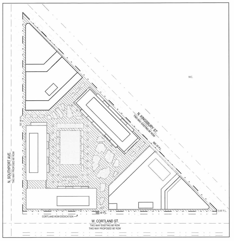 The first phase of the development will be Subarea D, a triangular parcel bound by N. Southport Ave to the west, W. Cortland St to the south, and N. Kingsbury St to the northeast. The site will have an 11-story hotel building at the corner of N. Southport Ave and N. Kingsbury St expected to stand 156 feet tall with 180-200 hotel rooms, parking, and retail space at the ground floor.