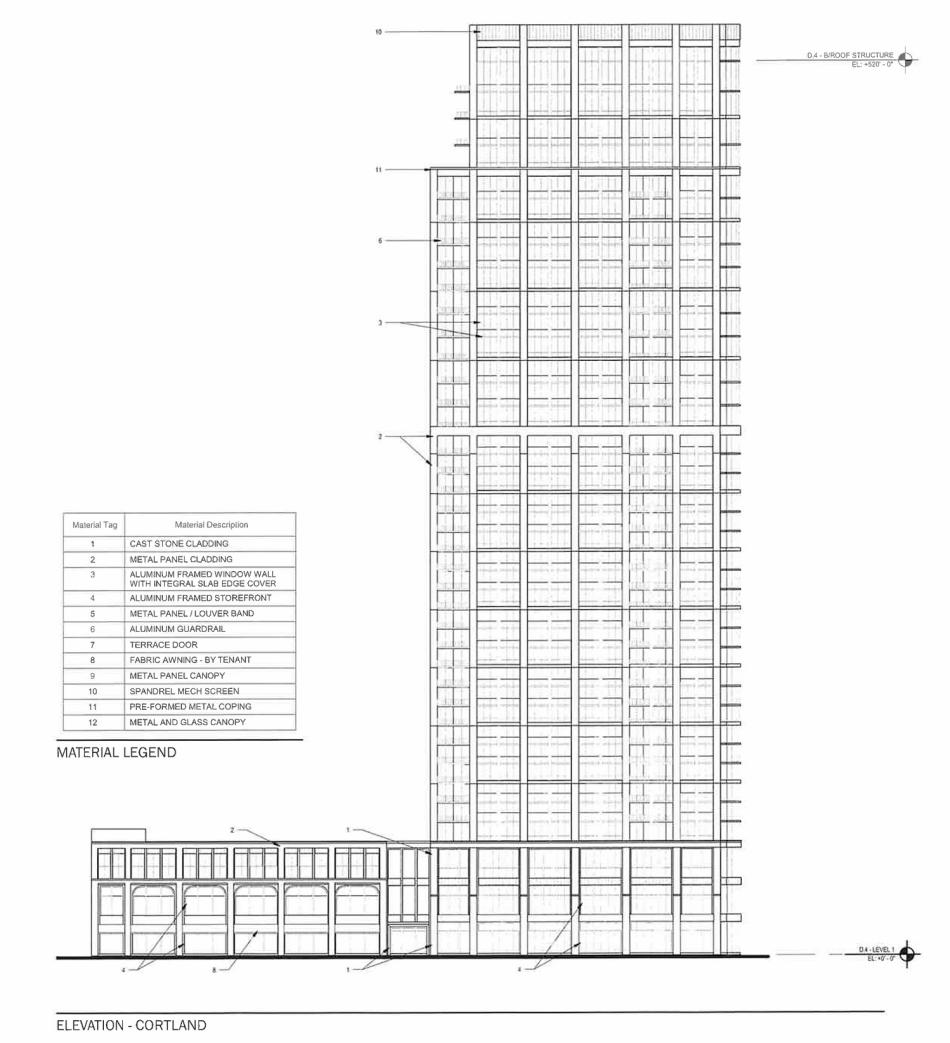 A 13-story residential building midblock along N. Kingsbury St will stand 170 feet tall and an 8-story residential building at the corner of N. Southport Ave and W. Cortland St will reach 116 feet tall. The tallest building in the entire development will stand at the corner of W. Cortland St and N. Kingsbury St, standing 38 stories high with residential, office, and retail, reaching a height of 520 feet tall.