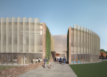 The circular office building and fieldhouse was designed by John Ronan Architects