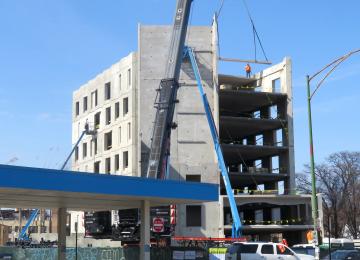 Work continues on a 100-unit affordable housing project on Emmett Street and a market-rate development along Milwaukee Avenue